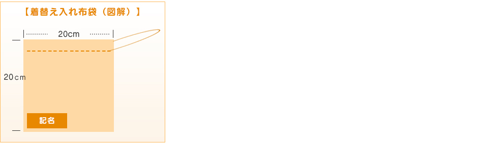 | 着替え入れ布袋 | 20×20センチの巾着袋(記名) ※下記参照 |